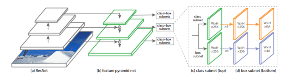 - focal loss와 FPN( Feature Pyramid Network )를 적용한 네트워크를 사용함.