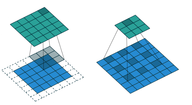 - 일반적인 컨볼루션과 달리 더 넓은 영역을 보도록 해주기 위한 방법으로, 커널이 일정 간격으로 떨어져 있음.