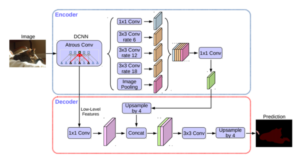 - ASPP(Atrous Spatial Pyramid Pooling)가 있는 블록을 통해 특성을 추출하고, 디코더에서 Upsampling을 통해 세그멘테이션 마스크를 얻음.